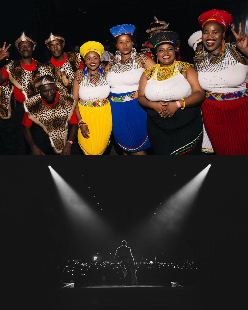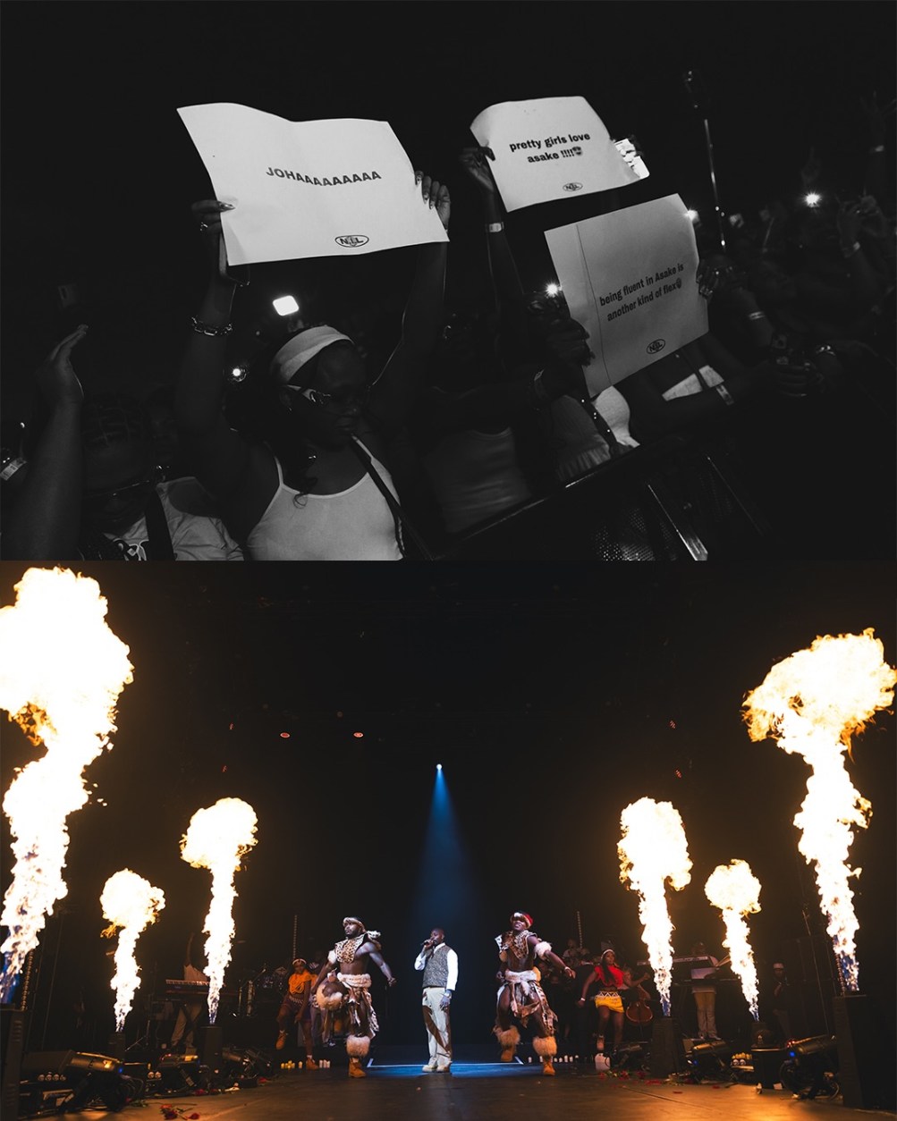 The lights dimmed, leaving the sea of white dots from smartphone flashlights as the primary light source in the dome. The lead guitarist revved the crowd up with a rousing guitar riff. Excited screams spilled out from every corner. Boisterous drums rolled, and his band—complete with guitarists, keyboardists, drummers, and a string quartet—began playing an entrancing Afrobeat prelude evoking Fela’s music. Just when the crowd started to settle into the languid Afrobeat grooves, the band smoothly changed tack. The stage lights, which had been emitting subtle shades of amber, changed to a gentle green; presumably a metaphor for Asake’s current “M$ney” era. Asake’s band began playing the instrumental of his 2025 hit Why Love, sending jolts of excitement through the crowd. As pyrotechnic flames flared and the screams from the audience took on increased intensity, Asake bounded up the stage wearing a beige collarless suit and brown Timberlands. Clutching a standing microphone, under the greenish haze of a spotlight, he delivered the first few notes that officially started the show.